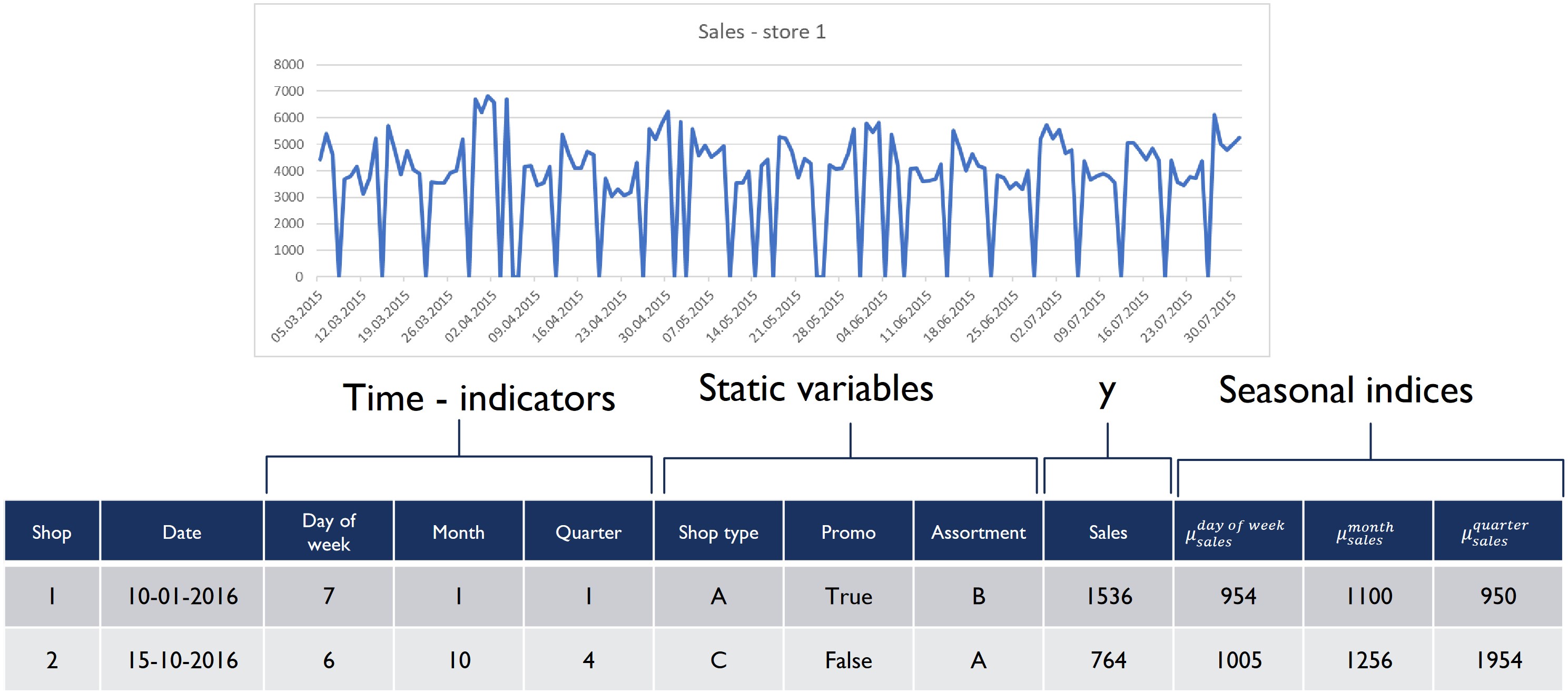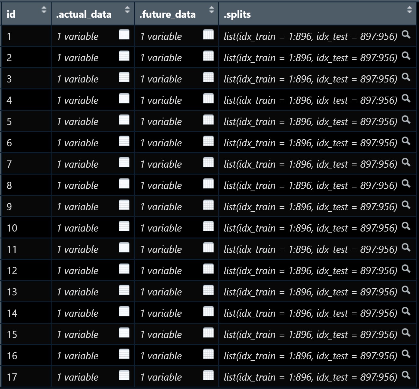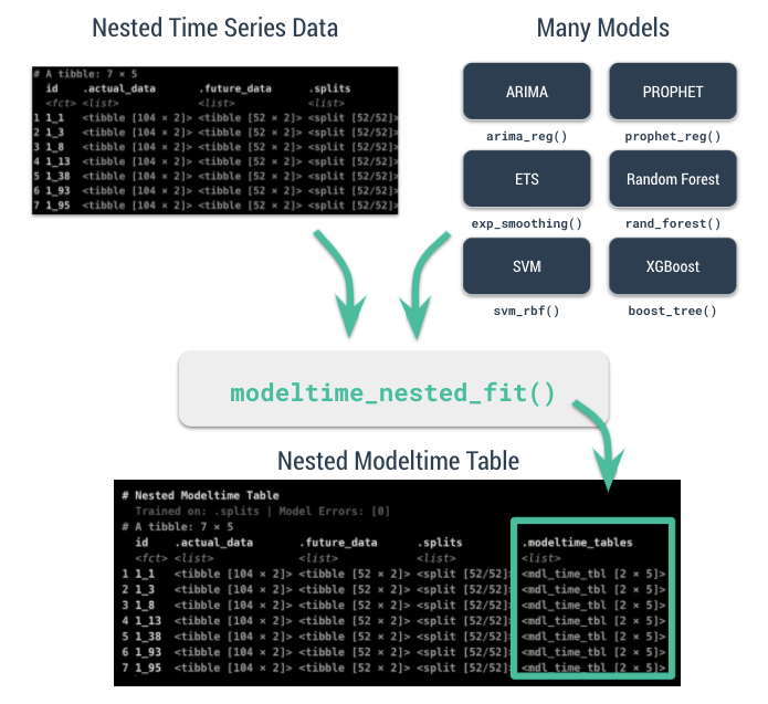 Singapore Management University ] .date[ ### 2022-7-16 (updated: 2022-07-30) ] --- # Content .vlarge[ + The motivation + Principles of nested forecasting approach + Nested forecasting processes + Nested forecasting with modeltime ] --- ## Motivation of Nested Forecasting Approach .large[ In real world practice, it is very common a forecaster is required to forecast multiple time series by fitting multiple models. ] .center[ ] --- class: center, middle # Nested Forecasting  .small[ Source: [Getting Started with Modeltime](https://business-science.github.io/modeltime/articles/nested-forecasting.html) ] --- ## Setting Up R Environment .pull-left[ For the purpose of this hands-on exercise, the following R packages will be used. ```r pacman::p_load(tidyverse, tidymodels, timetk, modeltime) ``` + [**tidyverse**](https://lubridate.tidyverse.org/) provides a collection of commonly used functions for importing, wrangling and visualising data. In this hands-on exercise the main packages used are readr, dplyr, tidyr and ggplot2. ] .pull-right[ + [**modeltime**](https://business-science.github.io/modeltime/index.html) a new time series forecasting package designed to speed up model evaluation, selection, and forecasting. modeltime does this by integrating the [**tidymodels**](https://www.tidymodels.org/) machine learning ecosystem of packages into a streamlined workflow for tidyverse forecasting. ] --- ## The data .pull-left[ In this sharing, [**Store Sales - Time Series Forecasting: Use machine learning to predict grocery sales**](https://www.kaggle.com/competitions/store-sales-time-series-forecasting/overview) from Kaggle competition will be used. For the purpose of this sharing, the main data set used is *train.csv*. It consists of six columns. They are: + *id* contains unique id for each records. + *date* gives the sales dates. + *store_nbr* identifies the store at which the products are sold. + *family* identifies the type of product sold. + *sales* gives the total sales for a product family at a particular store at a given date. Fractional values are possible since products can be sold in fractional units (1.5 kg of cheese, for instance, as opposed to 1 bag of chips). + *onpromotion* gives the total number of items in a product family that were being promoted at a store at a given date. ] -- .pull-right[ For the purpose of this sharing, I will focus of grocery sales instead of all products. Code chunk below is used to extract grocery sales from *train.csv* and saved the output into an rds file format for subsequent used. ```r grocery <- read_csv( "data/store_sales/train.csv") %>% filter(family == "GROCERY") %>% write_rds( "data/store_sales/grocery.rds") ``` ] --- ### Step 1: Data Import and Wrangling .pull-left[ In the code chunk below, `read_rds()` of **readr** package is used to import grocery.rds data into R environment. Then, `mutate()`, `across()` and `as.factor()` are used to convert all values in columns 1,3 and 4 into factor data type. ```r grocery <- read_rds( "data/store_sales/grocery.rds") %>% mutate(across(c(1, 3, 4), as.factor)) %>% filter(date >= "2015-01-01") ``` ] -- .pull-right[ In the code chunk below, `read_csv()` is used to import *stores.csv* file into R environment. TThen, `mutate()`, `across()` and `as.factor()` are used to convert values in columns 1to 5 into factor data type. ```r stores <- read_csv( "data/store_sales/stores.csv") %>% mutate(across(c(1:5), as.factor)) %>% select(store_nbr, cluster) ``` ] --- ### Data integration and wrangling .pull-left[ In the code chunk below, `left_join()` of **dplyr** package is used to join *grocery* and *stores* tibble data frames by using *store_nb*r as unique field. ```r grocery_stores <- left_join( x = grocery, y = stores, by = "store_nbr") ``` ] -- .pull-right[ In the code chunk below, a new tibble data frame called *grocery_cluster* is derived by summing sales values by values in cluster and date fields. ```r grocery_cluster <- grocery_stores %>% group_by(cluster, date) %>% summarise(value = sum(sales)) %>% select(cluster, date, value) %>% set_names(c("id", "date", "value")) %>% ungroup() ``` ] --- ### Visualising the time series data: The code chunk .pull-left[ It is always a good practice to visualise the time series graphically. ```r grocery_cluster %>% group_by(id) %>% plot_time_series( date, value, .line_size = 0.4, .facet_ncol = 5, .facet_scales = "free_y", .interactive = FALSE, .smooth_size = 0.4) ``` ] --- ### Visualising the time series data: The plot  --- ## Preparation for Nested Forecasting .pull-left[ Before fitting the nested forecasting models, there are two key components that we need to prepare for: + **Nested Data Structure:** Most critical to ensure your data is prepared (covered next). + **Nested Modeltime Workflow:** This stage is where we create many models, fit the models to the data, and generate forecasts at scale. ] .pull-right[  ] --- ### Step 2: Preparing Nested Time Series Data Frame .pull-left[ .large[ There are three major steps in reparing the nested time series data frame. They are: + Creating an initial data frame and extending to the future, + Transforming the tibble data frame into nested modeltime data frame, and + Splitting the nested data frame into training and test (hold-out) data sets. ]] --- ### **Creating initial data frame and extending to the future** .pull-left[ Firstly, we will create a new data table and extend the time frame 60 days into the future by using [`extend_timeseries()`](https://business-science.github.io/modeltime/reference/prep_nested.html) of modeltime. ```r nested_tbl <- grocery_cluster %>% extend_timeseries( .id_var = id, .date_var = date, .length_future = "60 days") ``` ] .pull-right[  ] --- ### Nesting the tibble data frame .pull-left[ Next, [`nest_timeseries()`](https://business-science.github.io/modeltime/reference/prep_nested.html) is used to transform the newly created data frame in previous slide into a nested data frame by grouping the values in the *id